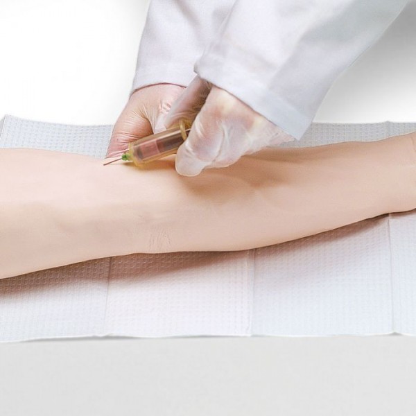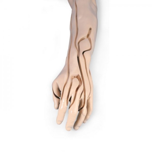 (Venae sectio), également des sites pour l'injection intramusculaire et intracutanée. Un vaste système vasculaire à 8 ramifications permet aux étudiants de s'exercer à pratiquer la ponction veineuse à tous les sites adéquats de premier rang et de second rang, ycompris la suspension de perfusions et l'introduction de cathéters périphériques à demeure. L'utilisation du système veineux estfacile, étant donné que toutes les veines sont alimentées en sang artificiel provenant d'une seule poche de liquide externe. Le dos de la main est équipé des veines métacarpiennes et des veines digitales pouvant recevoir une injection. Les exercices peuvent être effectués sur les V. basilica, V. cephalica, V. cephalica accessoria et V. mediana antebrachii. Les injections intramusculaires peuvent être réalisées au niveau du M. deltoideus. Des sites préparés sont situés sur le bras pour l'injection intracutanée. L'injection intramusculaire dans le M. deltoideus est particulièrement réaliste dans cette zone grâce à une peau molle et pratiquement naturelle et par les points d'orientation osseux pratiquement naturels. Les injections intracutanées avec de l'eau distillée provoquent les papules cutanées caractéristiques aux sites prévus du bras.